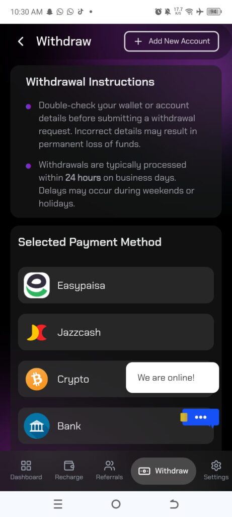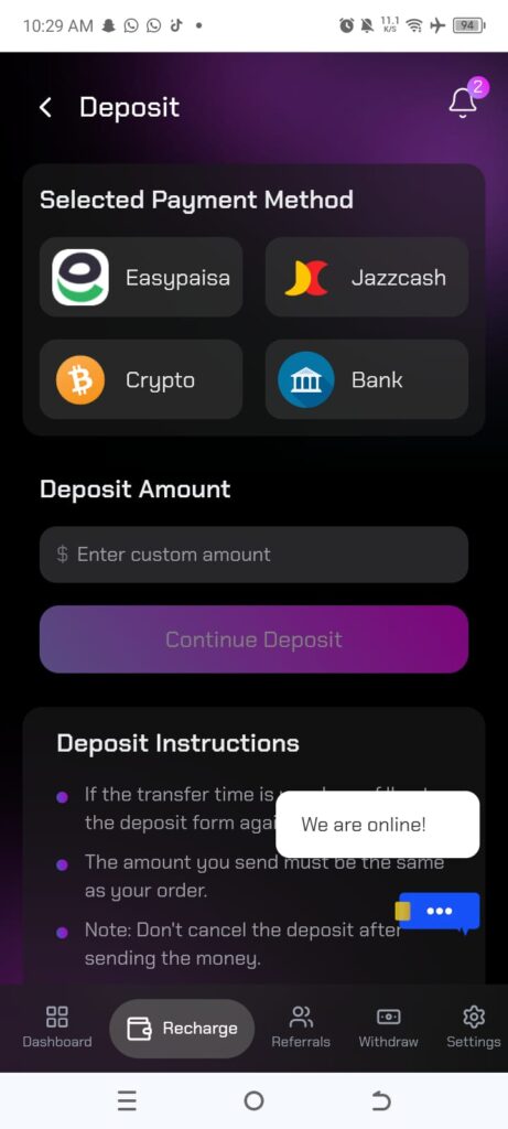 Before playing, users need to deposit funds. Pakistani users usually prefer local digital payment methods.